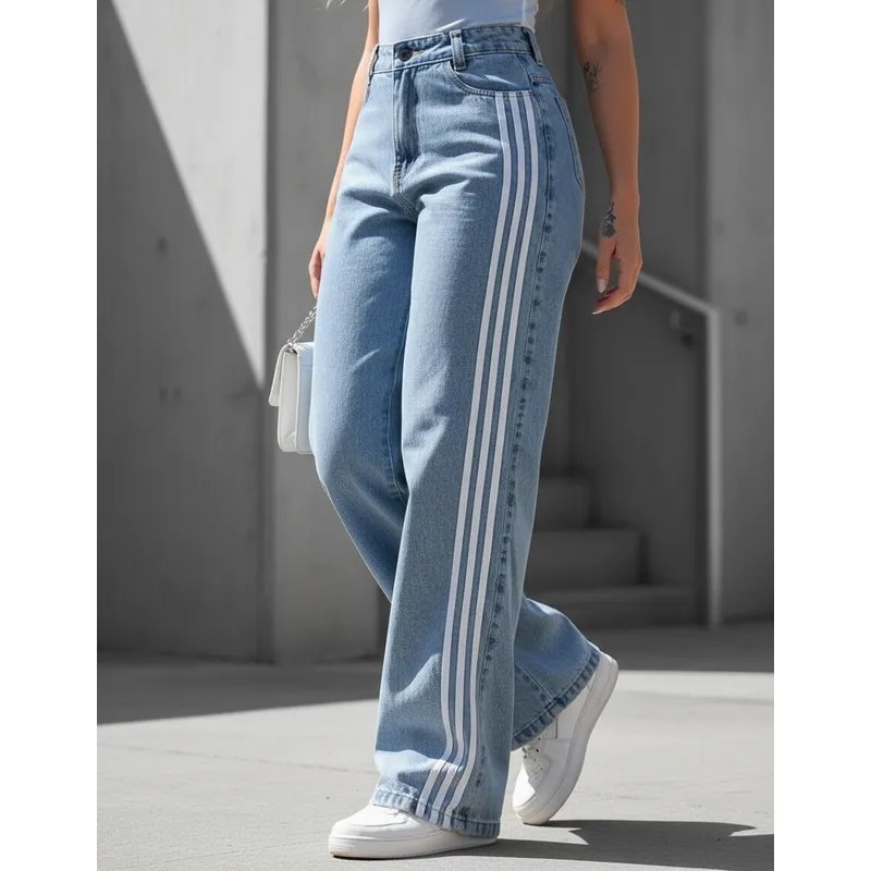 Calça Jeans Feminina Cargo Wide Leg Cintura Alta Listras Laterais Estilo Esportivo Streetwear
