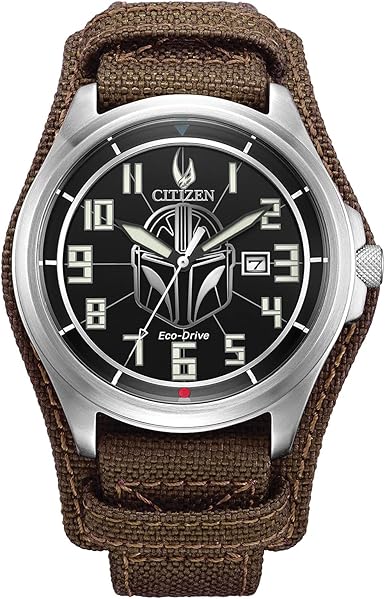 Citizen Relógio masculino Mandalorian Star Wars Eco-Drive, nylon marrom e couro, aço inoxidável, data com 3 ponteiros, luminoso, 44 mm (modelo: AW1411-05W), Prata, Moderno