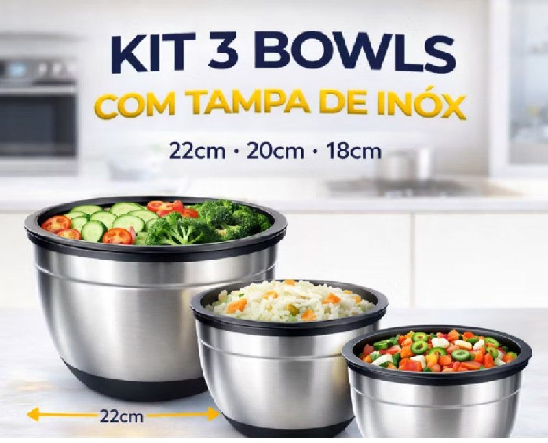Kit 3 Bowls Inox com Tampa Hermética