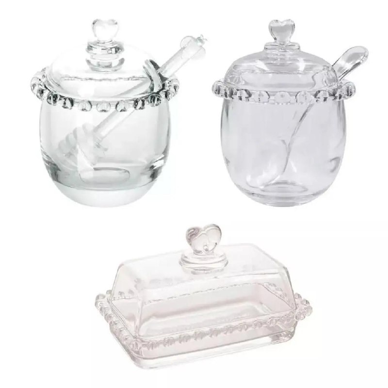 Kit 3 Pçs Meleira Açucareira Manteigueira Coração Cristal Lyor
