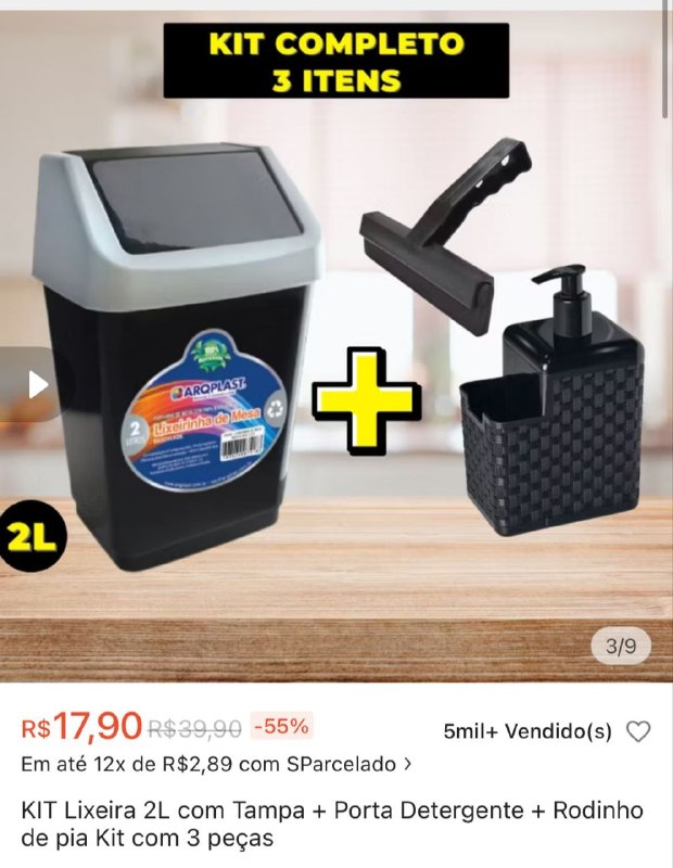 KIT Lixeira 2L com Tampa + Porta Detergente + Rodinho de pia