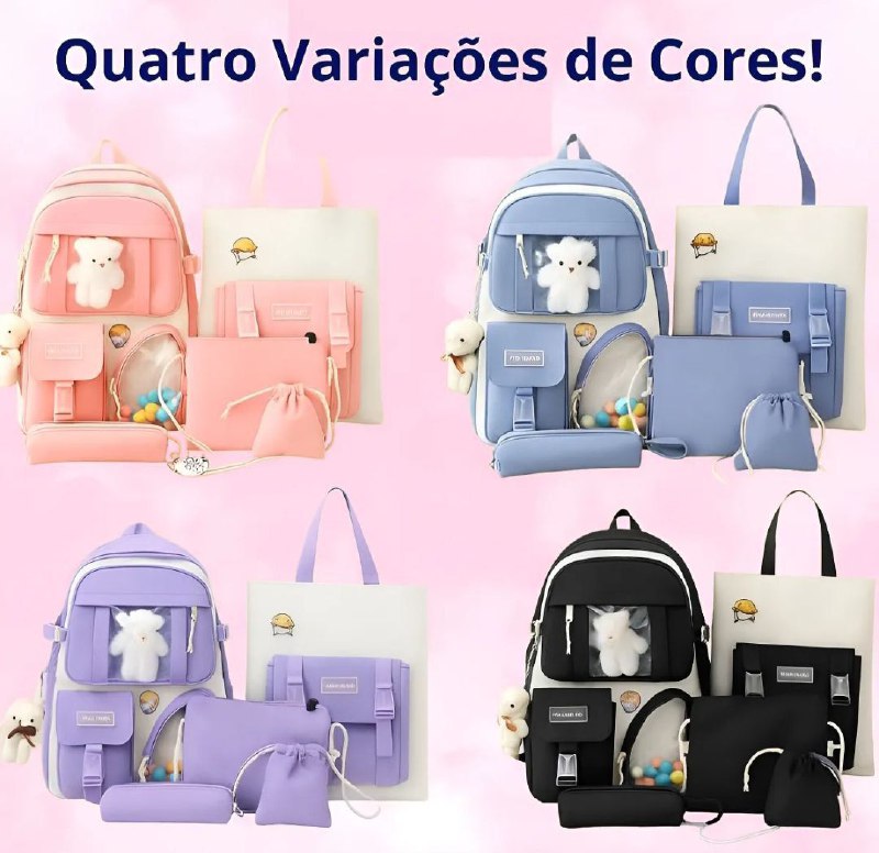 Kit Mochila Escolar 5 Peças Estojo Bolsa Unissex Ursinho