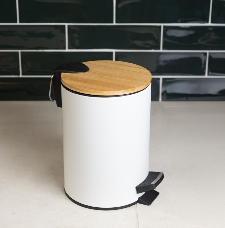 Lixeira Redonda de Metal com Pedal e Tampa em Bambu Branca 3L Lyor