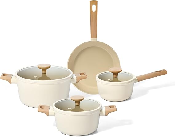 Oikos - Jogo com 4 Panelas Antiaderentes de Revestimento Cerâmico para Fogão por Indução, a Gás, Elétrico e Vitrocerâmico com Borda de Silicone Cor Bege Mou Nata