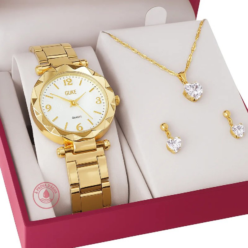 Relógio Feminino Analógico + Colar Brincos Folheado Ouro 18k